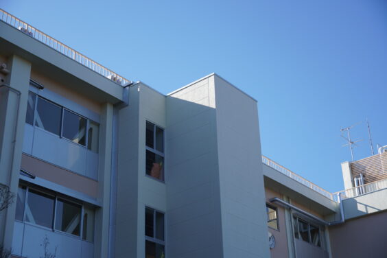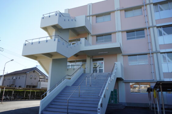 生徒の皆さんが毎日使う昇降口です。きれいに外壁が塗りなおされて、ピカピカです。
