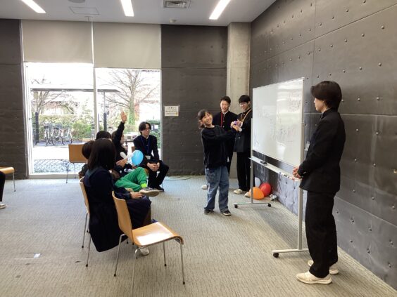 続いて、ジェスチャーゲーム大会。高校生が考えたテーマを、みんなで順番に体で表現していきます。チーム対抗戦ということもあって大盛り上がり!