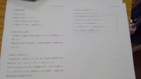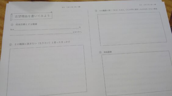 今回は、「志望理由書を書く練習」ということで、希望進路が定まらない生徒については、一律「教員」という設定で書いてもらいました。
